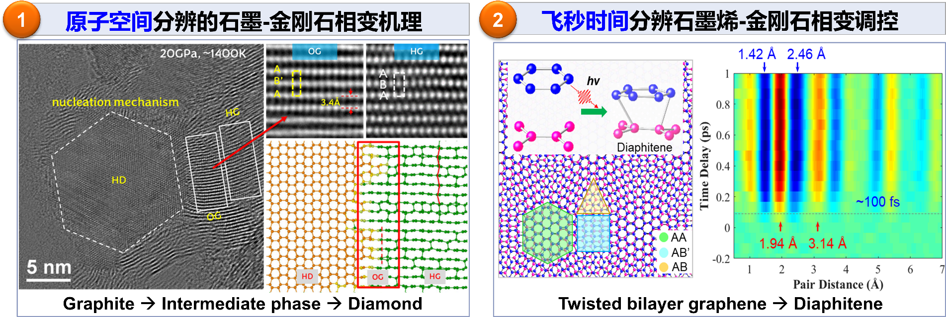 利用原子分辨的超快電子衍射技術,團隊對轉角雙層石墨烯進行了飛秒激光泵浦-超快電子探測實驗,首次發現具有特定AA/AB'堆垛的轉角石墨烯在約100 fs的超快時間尺度上形成瞬態二維金剛石結構“Diaphitene”,而純 AB 堆垛則未觀察到此現象。這一發現展示了超快光場調控相變的獨特潛能,為合成新型二維金剛石材料提供全新路徑[3]。